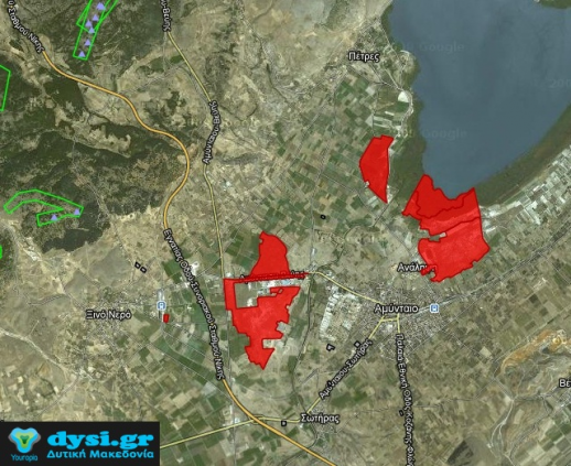 Συνεχίζοντας την ανάλυση του χάρτη, βλέπουμε και τη δημιουργία αλλεπάλληλων αιολικών πάρκων, στους λόφους πίσω από το Ξινό Νερό, και δίπλα στην Εθνική Οδό προς Φλώρινα. Η Δυτική Μακεδονία, ενεργειακός παράδεισος και η περιοχή του Αμυνταίου, στο νομό Φλώρινας, μπαίνει στη μάχη της φωτοβολταϊκής δραστηριότητας.